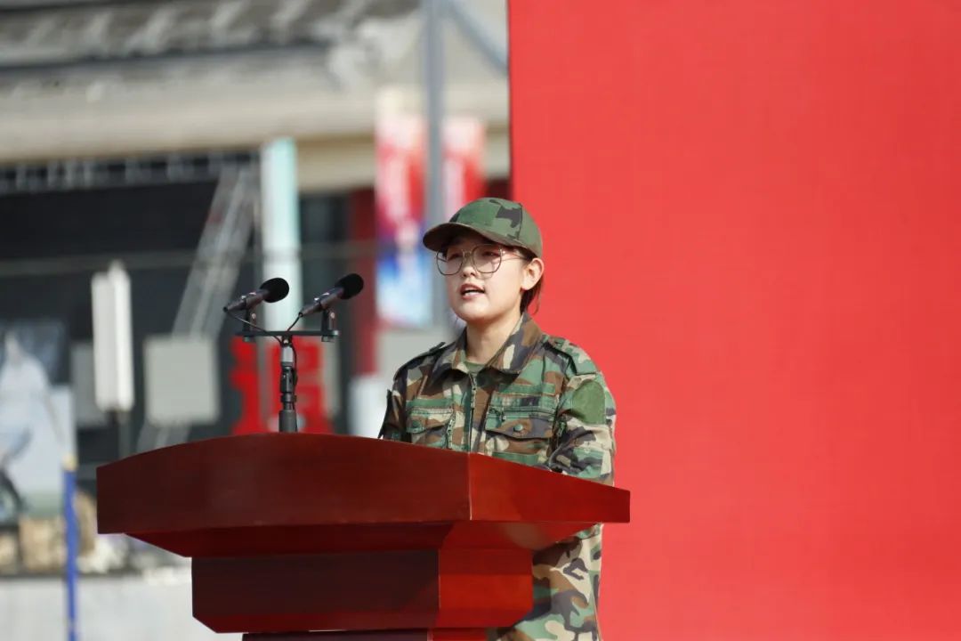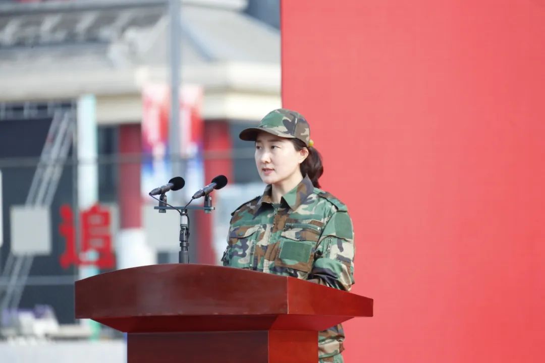 中医学院专职辅导员韩雪老师作为军训团指导员代表发言。她希望同学们能充分认识并理解军训的重要意义和价值,从中汲取力量,谨记“勤求博采、厚德济生”的校训,弘扬“自信向上、和而不同”的校风,成为有担当有责任感的新北中医人!