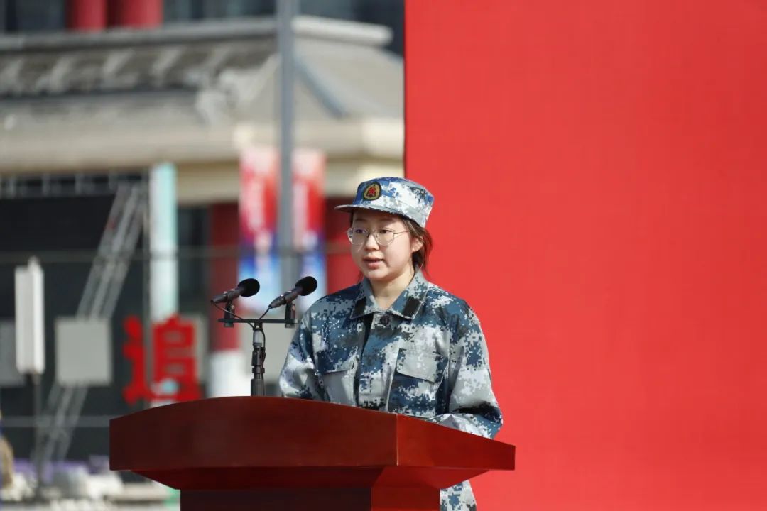 中医学院2023级王楚宣同学作为新生代表发言。她号召全体同学在军训中要对自己高标准、严要求,严守军纪,服从教官,一切行动听指挥,发扬团结互助的优良作风,认真参加训练,以顽强拼搏的精神面貌,展现新时代中医学子风采。